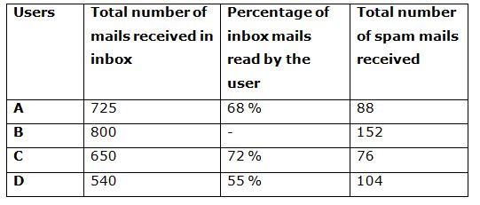 The following table shows the total number of mails received in inbox by different users and the percentage of mails read by the users and the total number of spam mails received in a month.