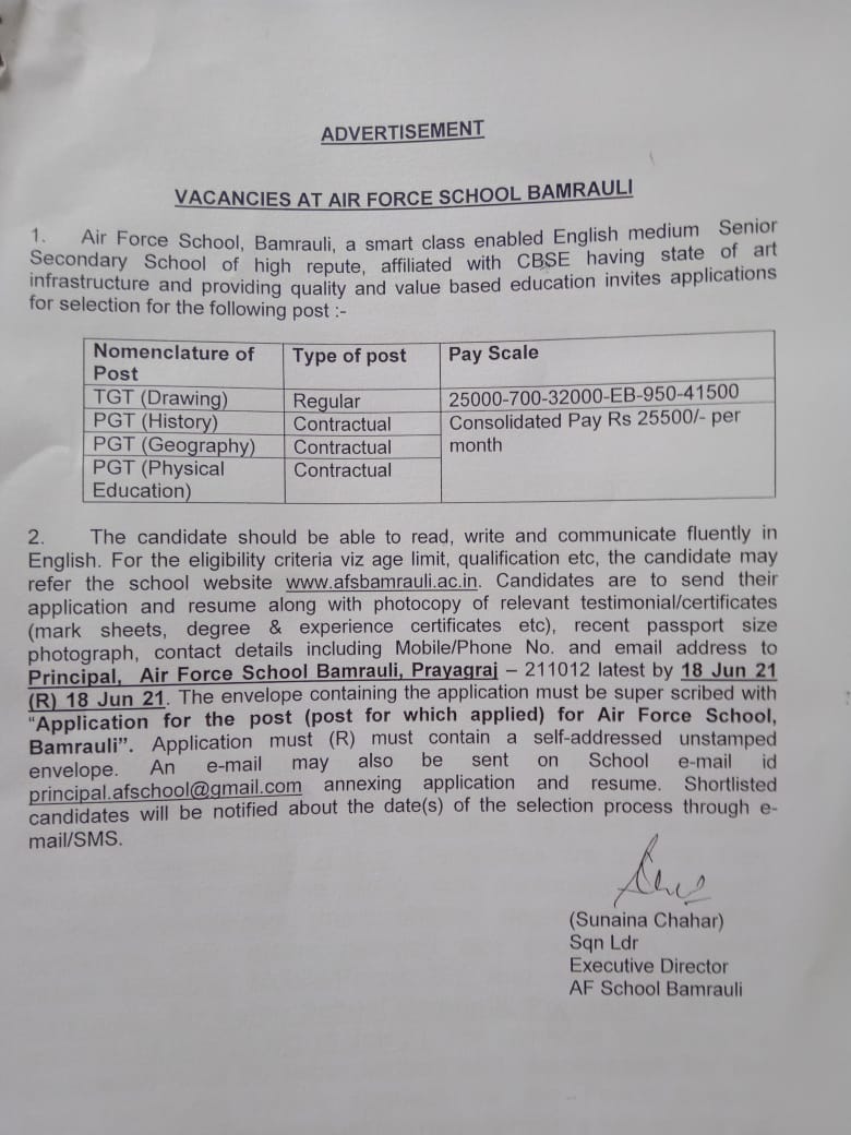 - The eligible candidates should apply for the recruitment the envelope containing the application must be super-scribed with “Application for the post (a post for which applied) for Air Force School, Bamrauli”, Application must (R) must contain a self-addressed unstamped envelope.