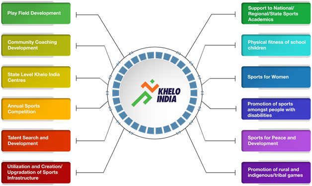 - Khelo India: National Programme for Development of Sports, branded as Khelo India( Play India), aims at improving India’s sports culture at the grass-root level through organized talent identification, structured sporting competitions and infrastructure development.