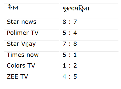 निम्नलिखित तालिका पुरुष और महिला टेलीविजन दर्शकों का अनुपात दिखाती है|