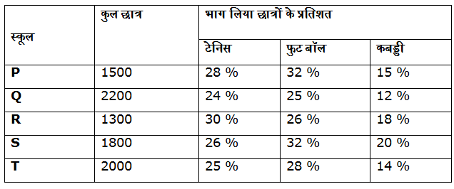 निम्नलिखित तालिका वर्ष 2017 के विभिन्न स्कूलों से विभिन्न खेलों (टेनिस, फुट बॉल और कबड्डी) में भाग लेने वाले कुल छात्रों का प्रतिशत वितरण दिखाती है और शेष छात्रों ने किसी भी गेम में भाग नहीं लिया।