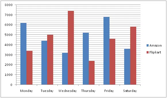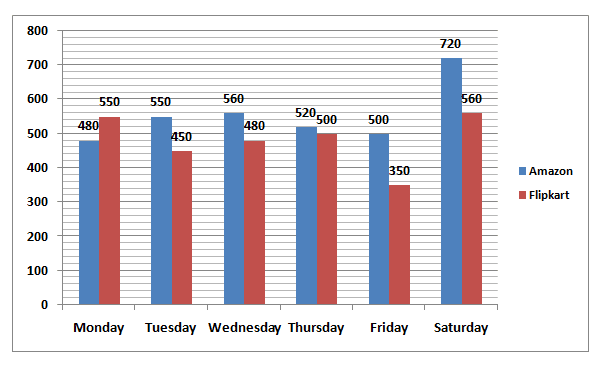 The given bar graph shows the number of wall paper stickers sold on two different platforms namely Amazon and Flipkart in six different days of a week from Monday to Saturday.