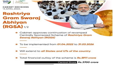 - The Cabinet Committee on Economic Affairs chaired by the Prime Minister, Shri Narendra Modi, today has approved continuation of revamped Centrally Sponsored Scheme of Rashtriya Gram Swaraj Abhiyan (RGSA) for implementation during the period from 04.2022 to 31.03.2026 (co-terminus with XV Finance Commission period) to develop governance capabilities of Panchayati Raj Institutions (PRIs).
