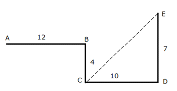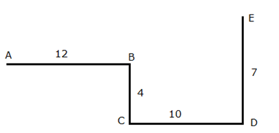 धिनेश ने बिंदु A से अपनी यात्रा शुरू की और पूर्व की तरफ 12 किमी की दूरी पर B तक पहुंच गया। फिर वह अपने दाहिने ओर चला गया और बिंदु C तक पहुंचने के लिए 4 किमी की दूरी पर चला। फिर वह अपने बाएं ओर चला और बिंदु D तक पहुंचने के लिए 10 किमी तक चला। वो फिर से बाएं मुड़ा और बिंदु E तक पहुंचने के लिए 7 किमी चला गया।