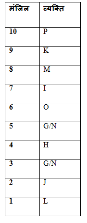 I O के के पास रहता है। I और L के बीच तीन से अधिक व्यक्ति रहते हैं। J एक विषम संख्या मंजिल नहीं रहता है। केवल एक व्यक्ति N और G के बीच रहता है।