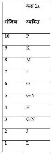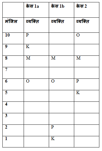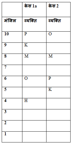 O और P के बीच केवल तीन व्यक्ति रहते हैं। K P के ठीक नीचे वाली मंजिल पर रहता है, लेकिन सबसे नीचे की मंजिल पर नहीं। केस 1 b समाप्त हो गया है क्योंकि हम इस मामले में K की स्थिति को ठीक नहीं कर सकते हैं। और शेष मामले बन जाते हैं