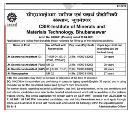 Council of Scientific & Industrial Research – Institute of Minerals & Materials Technology (IMMT) has released a short notification for the engagement of Junior Secretariat and Junior Stenographer post. A total of 14 vacancies were announced. The CSIR IMMT Recruitment 2021 Apply Online link will get activates on 20th May 2021. Interested candidates shall refer to the official notification to know the prescribed eligibility criteria and recruitment process. The final date for the submission of the online application gets ends on 21st June 2021. So eligible candidates shall start the online application and should submit it within the last date. Further details regarding CSIR IMMT Recruitment 2021 are given here for your reference.