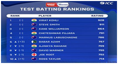 - न्यूजीलैंड के कप्तान केन विलयमसन 864 अंकों के साथ तीसरे स्थान पर हैं। चेतेश्वरपुजार ने चौथा स्थान हासिल किया लेकिन रहाणे सातवें स्थान पर खिसक गए। उनकी जगह पाकिस्तान के बाबर आज़म ने ले ली। भारत के मयंक अग्रवाल 12 वें स्थान पर हैं जबकि सीमित ओवरों के कप्तान रोहित शर्मा 15 वें स्थान पर हैं।