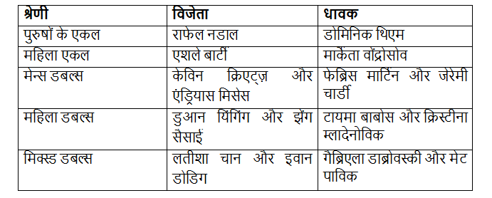 - फ्रेंच ओपन 2019 में, राफेल नडाल ने 9 जून, 2019 को पेरिस, फ्रांस में स्टेड रोलैंड गैरोस में एकल खिताब का दावा करने के लिए डोमिनिक थिएम को हराया।