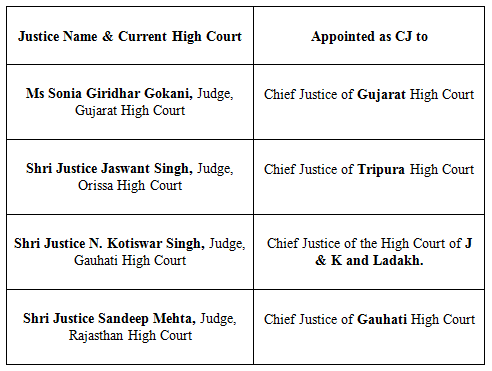 The Ministry of Law and Justice, Government of India (GoI) notified the appointment of Chief Justices (CJ) in 4 High Courts namely, Gujarat High Court, Tripura High Court, Gauhati High Court and Jammu-Kashmir and Ladakh High Court.