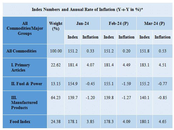 - The annual rate of inflation based on all India Wholesale Price Index (WPI) number is 0.53% (Provisional) for the month of March, 2024 (over March, 2023).