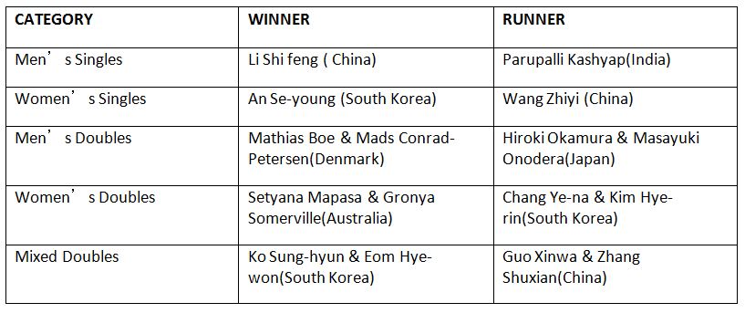12) Parupalli Kashyap lost to which player in men’s single finals of Canada Open Super 100 tournament to settle for silver?