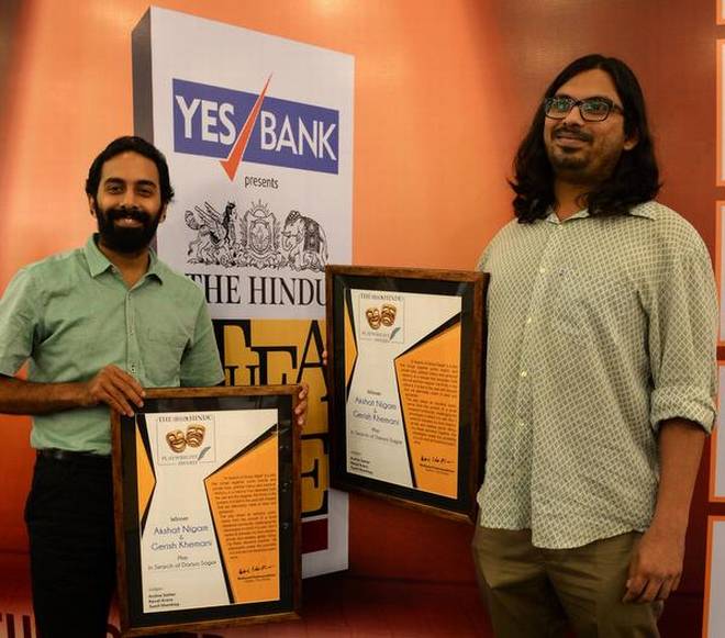 The Hindu Playwright Award 2017 went to Gerish Khemani and Akshat Nigam for their play ‘In Search of Dariya Sagar’. The other shortlisted works included Deepika Arwind’s ‘The Playwright is Dead’ and K. Madavane’s ‘1947 – The Man from Lahore’, chosen by a panel of three judges from among the 183 entries received.
