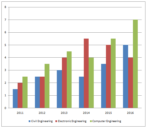 - What is the percentage of the number of average applicants for Civil Engineering with respect to that of average applicants for Electronic Engineering over the given period 2011-2016?