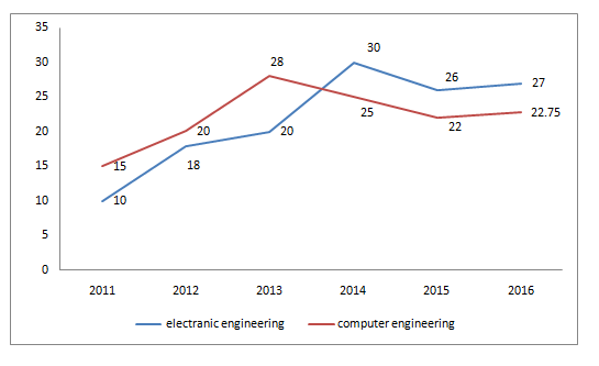 The following graph shows the number of female applicants of Electronic Engineering and Computer Engineering in thousands per one lakh.