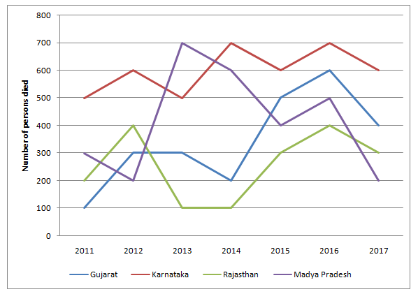 - In which state is the number of persons who died in the bus accidents the maximum during the given period?