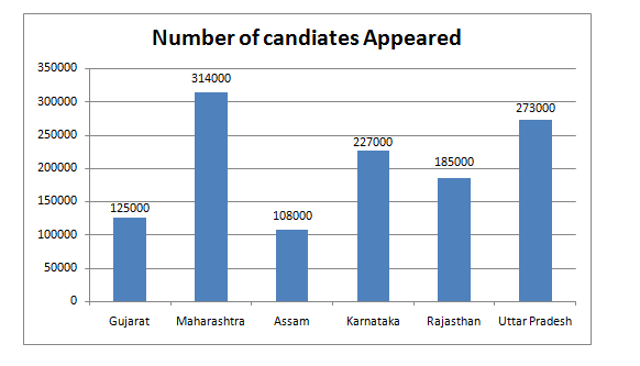 8) The number of candidates appearing for the exam from Assam and Gujarat together is what percent of the total number of candidates appearing for the exam from Maharashtra and Uttar Pradesh together? (rounded off to the nearest integer)