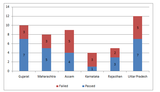 6) What is the respective ratio of the number of candidates failed in the Exam from Karnataka and Rajasthan together to those failed in the exam from Gujarat and Maharashtra together?