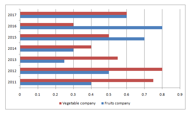 Direction (Q. 1-5): Following line graph shows the ratio of exports to imports of two companies Fruits Company and Vegetable Company over the period 2011 to 2017.