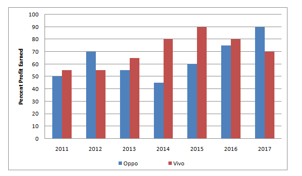 1. If the amount invested by the two companies in 2012 was equal, what was the ratio of the total income of the Oppo to that of Vivo in 2012?