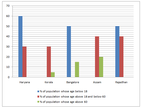 1. What is the ratio of the number of people whose age below 18 in Haryana and Bangalore together to the number of people of Assam and Rajasthan together whose age above 60?