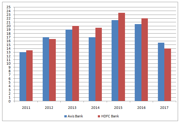 Percentage annual dividend offered by two banks Axis Bank and HDFC Bank over the years