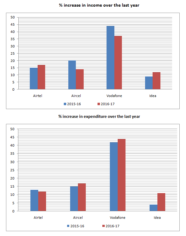 1. Let the income of the Airtel in 2014-15 be equal to Rs 500000 crores. If the expenditure of Airtel in 2016-17 is equal to the income of Airtel in 2014-15, then the income of Airtel in 2016-17 will be what per cent more than the expenditure of these companies in 2015-16(approx)?