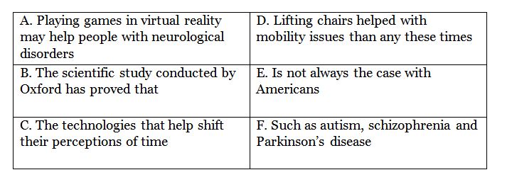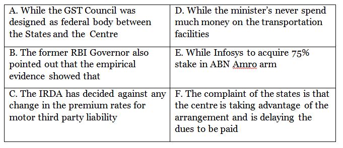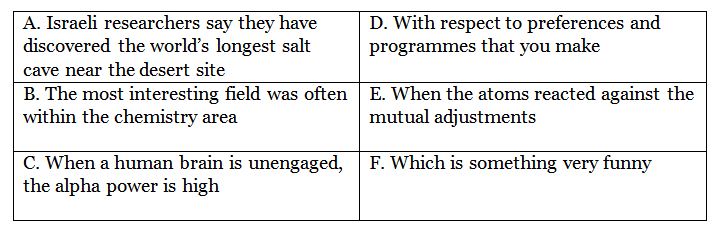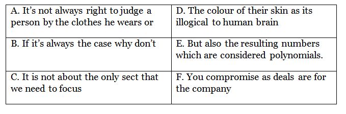 Direction (1-10): In the following questions two columns are given containing three sentences/phrases each. In first column, sentences/phrases are A, B and C and in the second column the sentences/phrases are D, E and F. A sentence/phrase from the first column may or may not connect with another sentence/phrase from the second column to make a grammatically and contextually correct sentence. Each question has five options, four of which display the sequence(s) in which the sentences/phrases can be joined to form a grammatically and contextually correct sentence. If none of the options given forms a correct sentence after combination, mark (e), i.e. “None of these” as your answer.