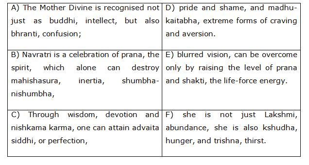 (B-D): Navratri is a celebration of prana, the spirit, which alone can destroy mahishasura, inertia, shumbha-nishumbha, pride and shame, and madhu-kaitabha, extreme forms of craving and aversion.