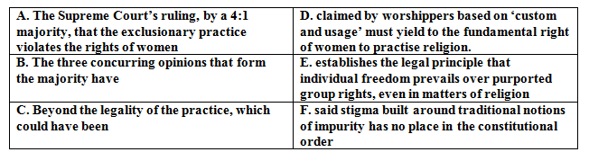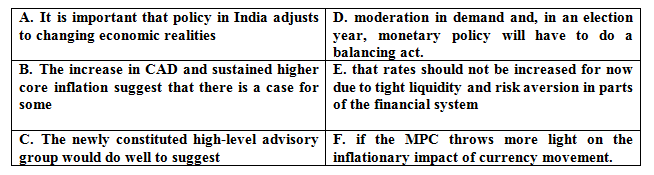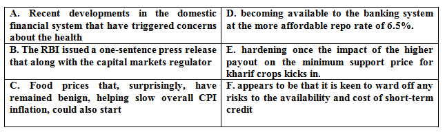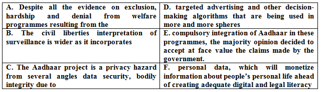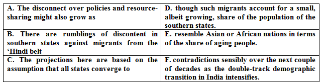 Direction (6-10): In the following questions two columns are given containing three sentences/phrases each. In first column, sentences/phrases are A, B and C and in the second column the sentences/phrases are D, E and F. A sentence/phrase from the first column may or may not connect with another sentence/phrase from the second column to make a grammatically and contextually correct sentence. Each question has five options, four of which display the sequence(s) in which the sentences/phrases can be joined to form a grammatically and contextually correct sentence. If none of the options given forms a correct sentence after combination, mark (e), i.e. “None of these” as your answer.