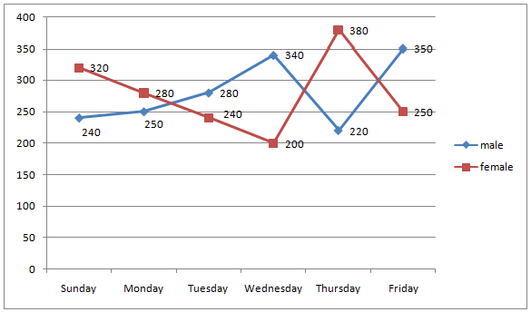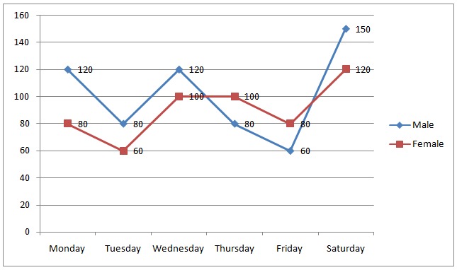The following line graph shows the number of students (male + female) attended class on six different days.