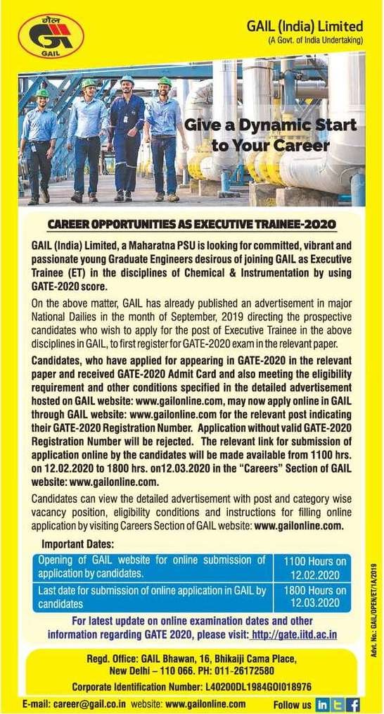 GAIL Recruitment 2020: GAIL Executive Trainee Recruitment 2020!!! Details regarding the GAIL Vacancy, Eligibility, & Apply Online are available here. Interested candidates shall refer to the GAIL Careers and refer to the official notification. For further details regarding the GAIL Recruitment Through GATE 2020 is available here below.