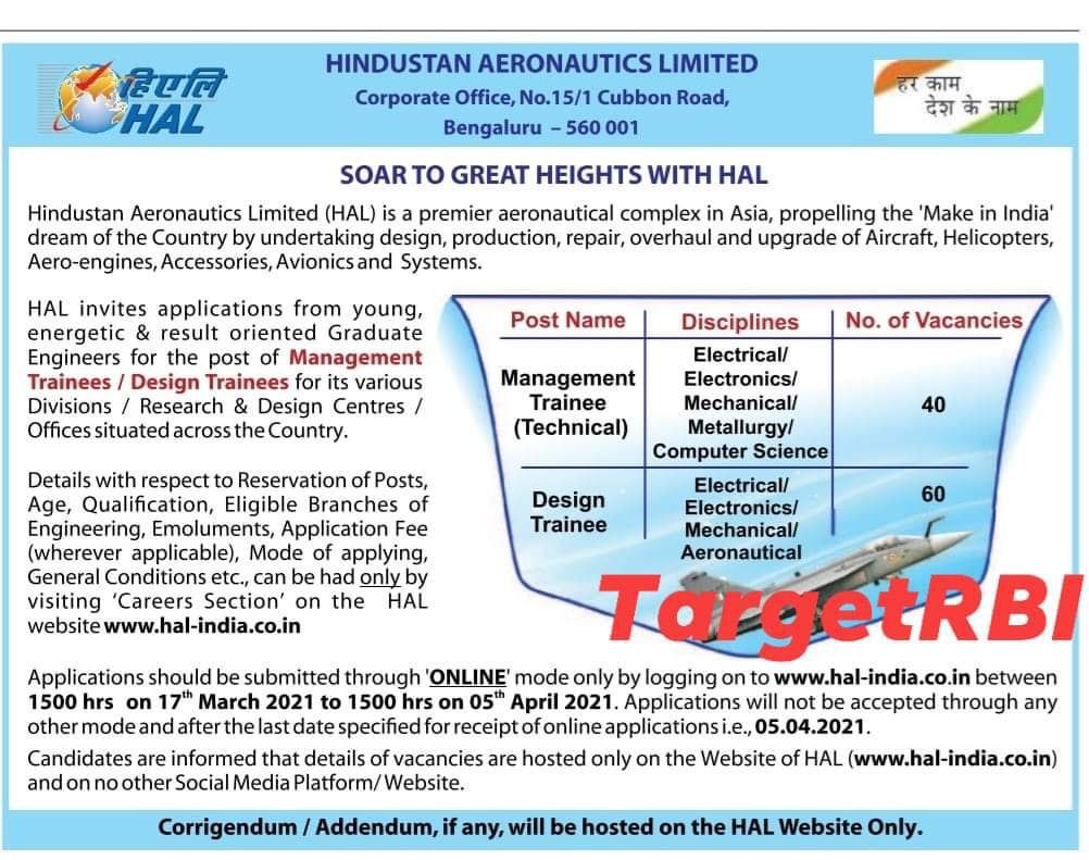 HAL Management Trainee Recruitment 2021: Hindustan Aeronautics Limited has released the Official notification to hire candidates for the post of Management Trainee. A total of 100 vacancies has been announced for HAL Management Trainee Recruitment 2021. Interested candidates can apply online for HAL Management Trainee Recruitment 2021 on or before 5th April 2021 on the official website @hal-india.co.in/.