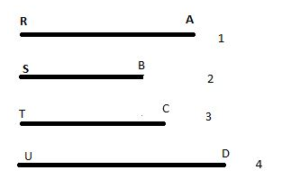 In the given figure the four lines segments 1, 2, 3, and 4 are RA, SB, TC, and UD respectively. The lengths of the lines are 28 m, 24 m, 26 m, and 41 m respectively.