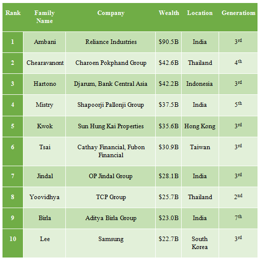 अंबानी परिवार 90.5 बिलियन डॉलर (₹7.85 लाख करोड़) की संपत्ति के साथ सूची में सबसे ऊपर है, जो एशिया में, विशेष रूप से भारत में बहु-पीढ़ी के परिवार द्वारा संचालित व्यवसायों के महत्वपूर्ण आर्थिक प्रभाव को उजागर करता है।