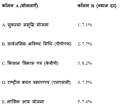 1) अक्टूबर–दिसंबर 2025 के लिए निम्नलिखित लघु बचत योजनाओं का उनकी संबंधित ब्याज दरों से मिलान करें: