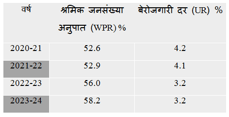 4) सांख्यिकी एवं कार्यक्रम कार्यान्वयन मंत्रालय (MoSPI) द्वारा 2017-18 से किए जा रहे आवधिक श्रम बल सर्वेक्षण (PLFS) के अनुसार, यह भारत में रोज़गार और बेरोज़गारी के डेटा का आधिकारिक स्रोत है। 2023-24 में 15 वर्ष और उससे अधिक आयु के व्यक्तियों के लिए श्रमिक जनसंख्या अनुपात (WPR) क्या था?