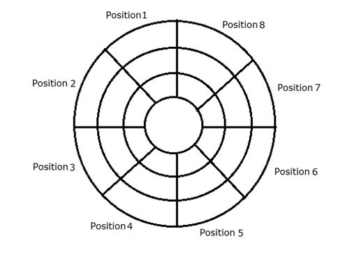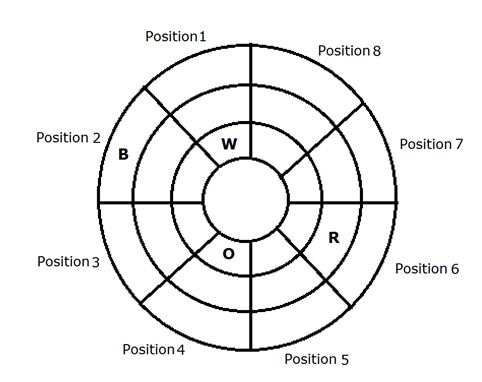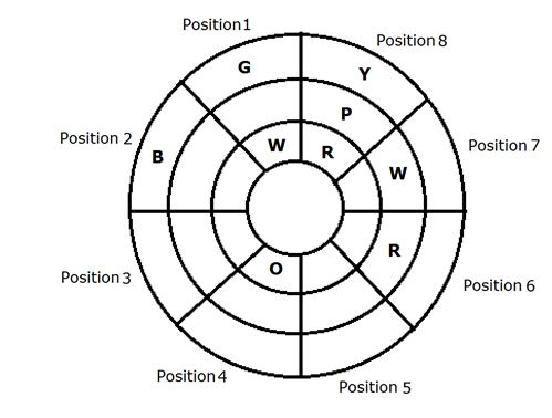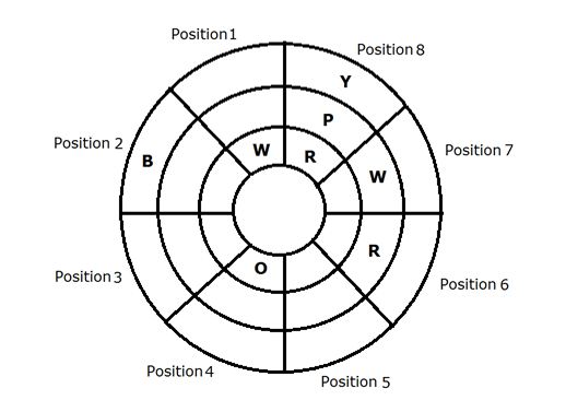 Note: For example, In outermost wheel if white part is to the immediate right of Pink part, then the position of white part is to the immediate right of pink part in the innermost and middle wheel.