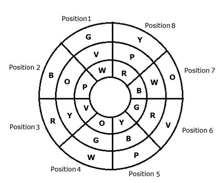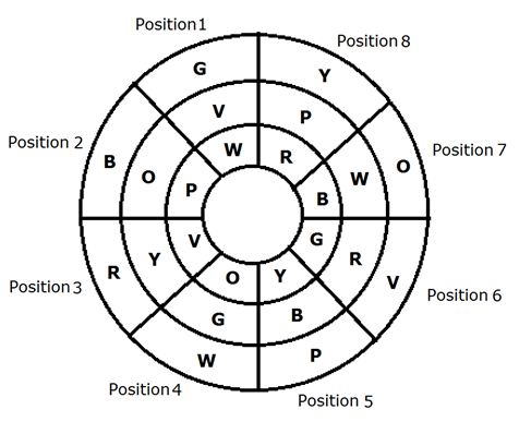 “Wheel of Fortune” is a game that involves turning three concentric wheels simultaneously and it is in the form as shown in the figure below. The eight colours are Red (R), White (W), Orange (O), Yellow (Y), Pink (P), Green (G), Blue (B) and Violet (V) but not in the same order.