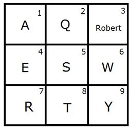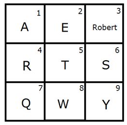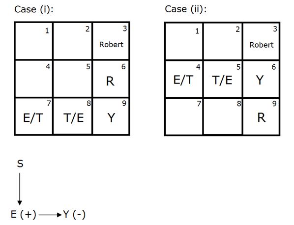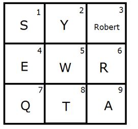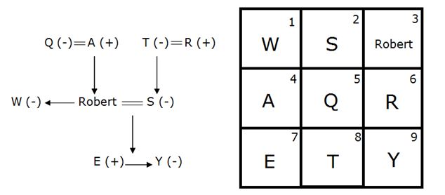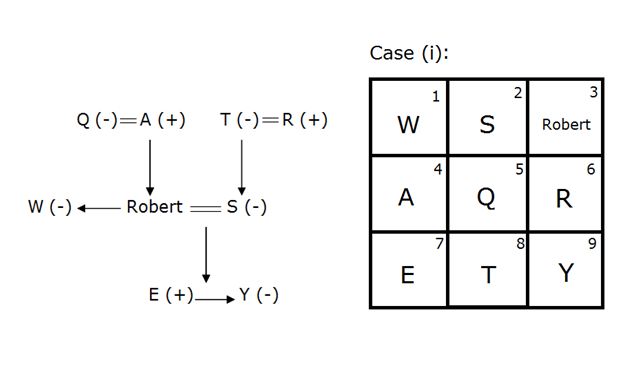Robert’s family plans for a trip. He takes his family in a van having 3 rows of 3 seats each, the seats in the first row are numbered 1, 2 and 3. The seats in the 2nd row are numbered 4, 5 and 6 and those in the last row are numbered 7, 8 and 9. The seats are arranged in a grid form with 3 rows and 3 columns. The seats were occupied by Q, W, E, R, T, Y,A and S but not necessarily in the same order. Also it is known that,