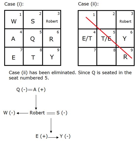 (iv) Q occupies seat numbered 5 and is in same row as his husband A and is not seated immediately in front of Robert’s son E.