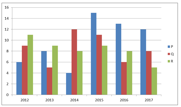 निम्नलिखित बार ग्राफ विभिन्न वर्षों में 3 अलग–अलग कंपनियों के लाभ% को दर्शाता है।