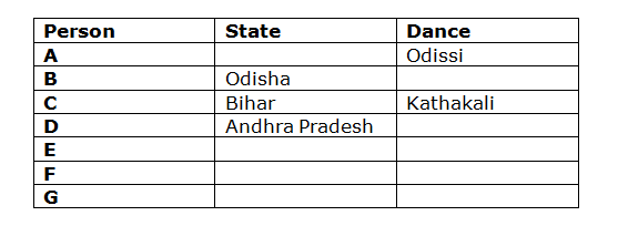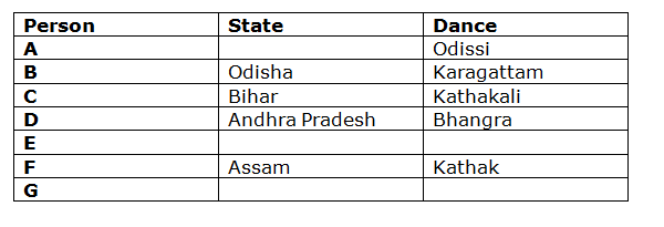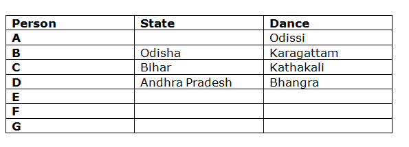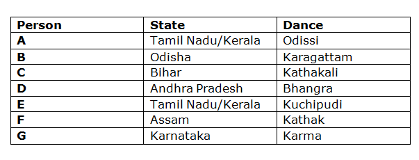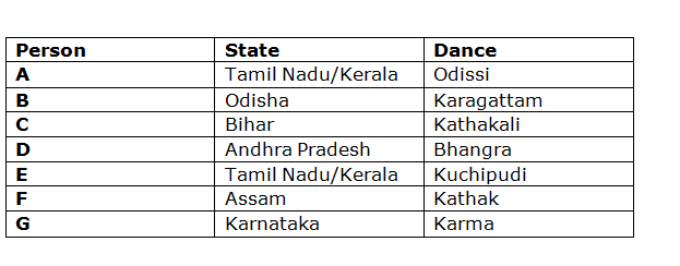 सात व्यक्ति – A, B, C, D, E, F और G सात अलग-अलग राज्यों अर्थात् तमिलनाडु, बिहार, केरल, आंध्र प्रदेश, कर्नाटक, उड़ीसा और असम से संबंधित हैं, लेकिन जरूरी नहीं उसी क्रम में। उनमें से प्रत्येक अलग-अलग राज्य नृत्य करगट्टम, कथक, कुचीपुडी, भांगड़ा, कथकली, कर्मा और ओडिसी पसंद करते है, लेकिन जरूरी नहीं उसी क्रम में।