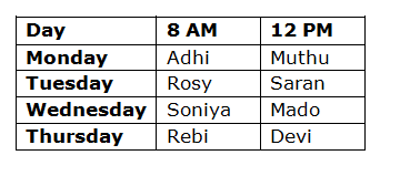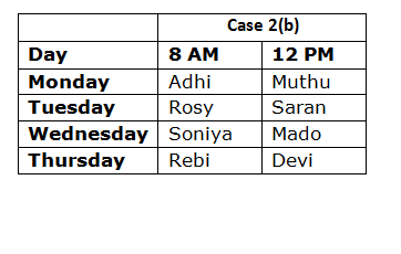आठ व्यक्ति – आदि, सरन, सोनिया, रेबी, रोज़ी, देवी, माडो और मुथू हैं। उनकी परीक्षा, एक सप्ताह में सोमवार से गुरुवार तक दिन के दो अलग-अलग सत्रों में निर्धारित होती है। परीक्षा का समय सभी दिनों के लिए समान हैं। दो सत्रों के बीच 4 घंटे का अंतर है। पहले सत्र का समय 8 AM है और दूसरा सत्र का समय 12 PM है।