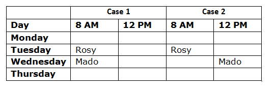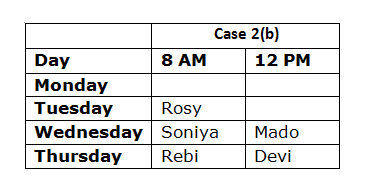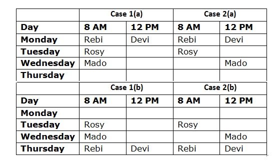 रोज़ी की मंगलवार को 8 AM में परीक्षा है। आदि के संबंध में सरन का परीक्षा अलग-अलग दिन के अलग-अलग सत्रों में है। आदि की परीक्षा, सरन की परीक्षा से किसी एक दिन पहले निर्धारित की गई है। सोनिया और रेबी की परीक्षा एक-ही सत्र में निर्धारित की गई थी और उनमें अधिक से अधिक एक परीक्षा का अंतर है। माडो की परीक्षा बुधवार को है और सत्र, मुथू की परीक्षा के समान है। देवी की परीक्षा, उसी दिन रेबी की परीक्षा के ठीक बाद निर्धारित है।