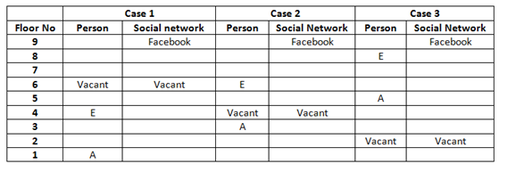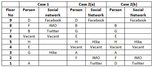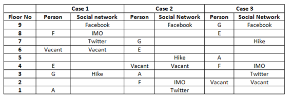 आठ दोस्तों- A, B, C, D, E, F, G और H नौ मंजिल की इमारत में रह रहे हैं। निम्नतम मंजिल को 1 गिना  जाता  हैं, इसके ऊपर दो गिना  जाता  हैं और तब तक जब तक कि शीर्षतम मंजिल आठ न हो। इमारत के मंजिल में से एक खाली है। उनमें से प्रत्येक को अलग-अलग सोशल नेटवर्क जैसे  फेसबुक, ट्विटर, व्हाट्सएप, टेलीग्राम, आई एम् ओ, वीचैट, हाइक और लाइन पसंद है, लेकिन एक ही क्रम में जरूरी नहीं है।