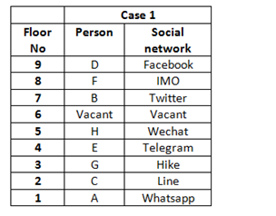 G और H के बीच केवल एक मंजिल है। वीचैट पसंद करने वाले और C दोनों के बीच केवल दो मंजिलें है। केवल एक मंजिल A और जो हाइक पसंद करता है के बीच है। खाली मंजिल के ऊपर मंजिल की संख्या और E के नीचे मंजिल की संख्या एक समान है। A E के नीचे किसी एक मंजिल पर रहता है। जो फेसबुक को पसंद करता है वह शीर्ष मंजिल पर रहता है। खाली मंजिल सम संख्या मंजिल है। उस व्यक्ति के बीच केवल तीन मंजिल है जो हाइक पसंद करते हैं और जो ट्विटर पसंद करते हैं। F और G  के बीच केवल चार मंजिल है H और B फेसबुक पसंद नहीं करते हैं। A और E के बीच केवल दो मंजिलें है| C और जो व्हाट्सएप पसंद करता है वह आसन्न मंजिल पर रहते है। वह जो टेलीग्राम पसंद करता है वह लाइन पसंद करने वाले व्यक्ति के ऊपर किसी एक मंजिल पर रहता है। B H के ऊपर किसी एक मंजिल पर रहता है A को लाइन पसंद नहीं है। F आईएम्ओ पसंद करता है और ट्विटर पर पसंद करने वाले व्यक्ति के तुरंत ऊपर रहता है। H और D के बीच केवल तीन मंजिलें है।
