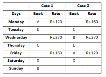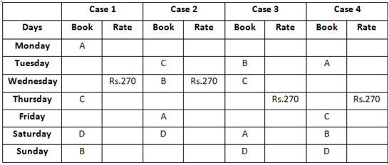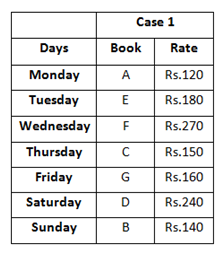 एक विक्रेता ने सात अलग-अलग किताबें A, B, C, D, E, F और G को सोमवार से शुरू होने वाले एक ही सप्ताह में सात अलग-अलग दिनों में बेचा और रविवार को समाप्त हुआ। अलग-अलग दरों के लिए बेची जाने वाली प्रत्येक पुस्तकें, 120 रुपये, 140 रुपये, 150 रुपये, 160 रुपये, 180 रुपये, 240 रुपये और 270 रुपये, लेकिन एक ही क्रम में जरूरी नहीं।