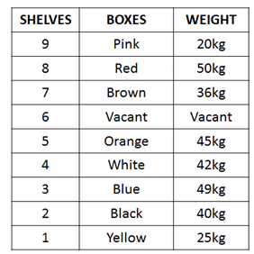 नीला रंग का बॉक्स नीचे से तीसरे स्थान पर रखा गया है। नीला रंग का बॉक्स और 36 किलो वजन वाले बॉक्स के बीच दो बक्से लगाए जाते हैं। लाल रंग के बक्से का वजन पीले रंग के रंग के बक्से के वजन का दोगुना है। 36 किलो वजन और 25 किलो वजन वाले बॉक्स के बीच चार बक्से लगाए जाते हैं। गुलाबी रंग बॉक्स समूह के बीच सबसे हल्का बॉक्स है। सबसे भारी बॉक्स को विषम संख्या पर नहीं रखा गया है। रिक्त शेल्फ और गुलाबी रंग के बॉक्स के बीच दो बक्से लगाए जाते हैं जो नीले रंग के बॉक्स के नीचे नहीं रखे जाते हैं। नारंगी रंग का बॉक्स का वजन लाल रंग के बॉक्स के वजन की तुलना में 5 किलो कम है। नारंगी रंग का बॉक्स सफेद रंग बॉक्स के ठीक ऊपर रखा गया है। लाल रंग के बक्से से ऊपर लगाए गए बॉक्सों की संख्या काले रंग के बक्से के नीचे लगाए गए बक्से की संख्या के समान ही है। भूरा रंग का बॉक्स लाल रंग बॉक्स के नीचे रखा गया है। सफ़ेद रंग का बॉक्स काला रंग के बॉक्स से भारी है लेकिन नीला रंग का बॉक्स से हल्का है। काला रंग का बॉक्स खाली शेल्फ के नीचे नहीं रखा गया है।