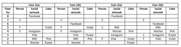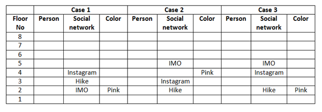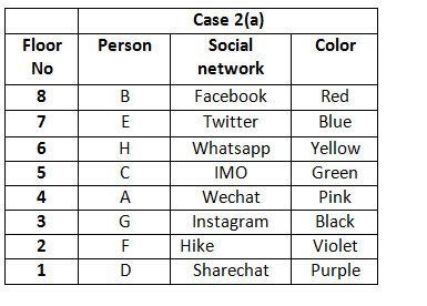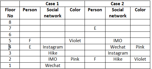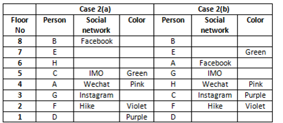 आठ व्यक्ति A, B, C, D, E, F, G और H आठ मंजिला इमारत में रह रहे हैं। निम्नतम मंजिल संख्या एक है, इसके ऊपर संख्या दो और इसी तरह शीर्षतम मंजिल आठ हो। उनमें से प्रत्येक को अलग-अलग सोशल नेटवर्क, Facebook, Wechat, Sharechat, Hike, Whatsapp, IMO, Instagram और Twitter पसंद है, लेकिन एक ही क्रम में जरूरी नहीं है। उनमें से प्रत्येक को अलग-अलग रंग भी पसंद हैं।
